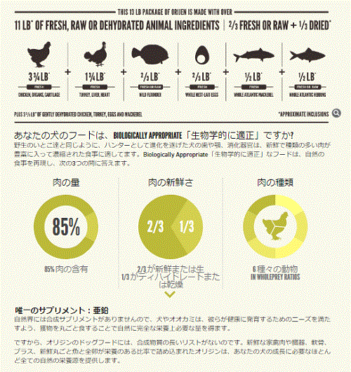 新鮮鶏肉, 新鮮七面鳥肉, 新鮮イエローテイルカレイ, 新鮮全卵, 新鮮丸ごと大西洋サバ, 新鮮鶏レバー, 新鮮七面鳥レバー, 新鮮鶏心臓, 新鮮七面鳥心臓, 新鮮丸ごと大西洋ニシン, ディハイドレート鶏肉, ディハイドレート七面鳥肉, ディハイドレート丸ごとサバ, ディハイドレート鶏レバー, ディハイドレート七面鳥レバー, 丸ごとグリーンピース, 丸ごとシロインゲン豆, 赤レンズ豆, 新鮮チキンネック,新鮮鶏腎臓, ピント豆, ヒヨコ豆, グリーンレンズ豆, レンズ豆繊維,天然鶏肉風味, 鶏軟骨, ニシン油, 粉砕鶏骨, 鶏肉脂肪, 七面鳥軟骨,乾燥ケルプ, フリーズドライ 鶏レバー, フリーズドライ 七面鳥レバー, 新鮮丸ごとカボチャ, 新鮮丸ごとバターナッツスクワッシュ, 新鮮ケール, 新鮮ホウレン草, 新鮮カラシ菜, 新鮮コラードグリーン, 新鮮カブラ菜, 新鮮丸ごとニンジン, 新鮮丸ごとリンゴ, 新鮮丸ごと梨, カボチャの種, ヒマワリの種, 亜鉛タンパク化合物, ミックストコフェロール(天然酸化防止剤), チコリー根, ターメリック, サルサ根, アルテア根, ローズヒップ, ジュニパーベリー, 乾燥 ラクトバチルスアシドフィルス菌発酵生成物, 乾燥 プロバイオティクス発酵生成物, 乾燥 ラクトバチルスカゼイ発酵生成物. ドッグフードとキャットフードやサプリメントなどドライフードを主に幼犬・仔犬・成犬 ・高齢犬 ・ダイエット・幼猫キトン・成猫・老猫 に対する食事を飼い主さんと一緒に考えながら歩んできました。
