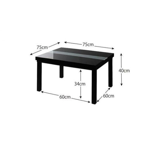 ■75 75 cm【サイズ】幅75 奥行75 高さ40cm【商品重量】24.5kg【梱包サイズ・重量】81.5 81.5 16.5cm/27kg■全サイズ共通【天板耐荷重】約20kg【材質】パーチクルボードフラッシュ板、MDF、5mm強化ガラス 仕上げ:UV塗装【カラー】グロスブラック/ラスターホワイト【ヒーター】 正方形(75 75) : 300W石英管ヒーター 長方形(75 105)・(80 120): 510W石英管ヒーター いずれも中間スイッチ式【電源コード長さ】約3m【梱包数】1【生産国】ベトナム【備考】ヒーター部メーカー1年保証付き ※組立品※鏡面仕上げは天板、天板側面に施しております。