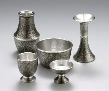 名称 サイズ(cm) 香炉 φ8.1×H4.5 花立 φ6.0×H9.2 ローソク立て φ4.9×H9.6 仏飯器 φ4.8×H3.6 水入れ φ4.3×H5.0 本錫100%でできた仏具セットです。